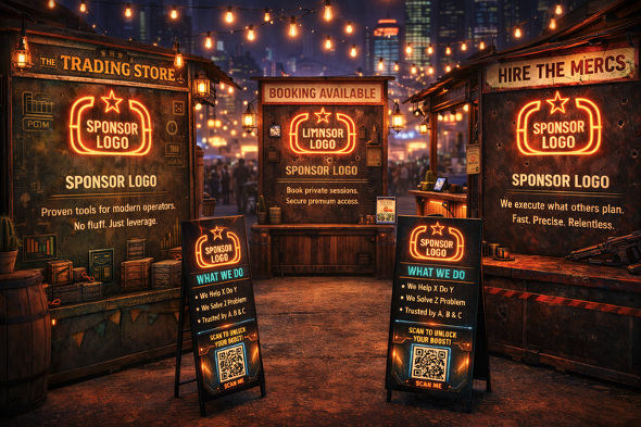 The sponsor area is designed as an immersive, future-themed night market where each booth operates as a high-attention trading post.